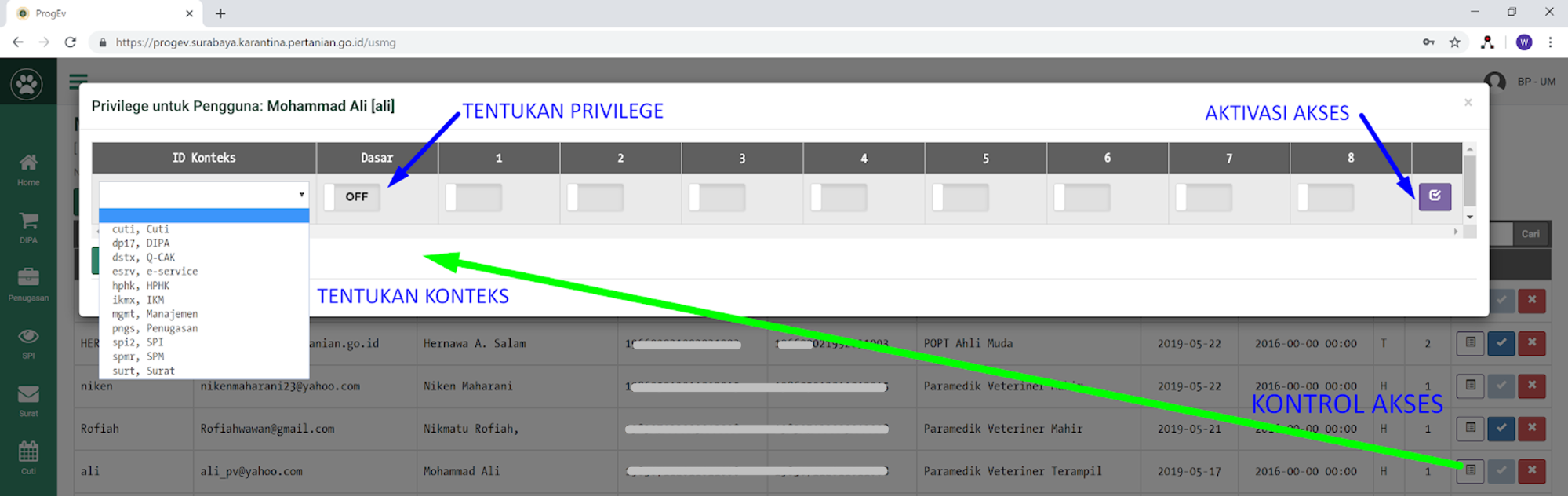 Meliputi: pengelolaan akses pengguna pegawai lingkup BBKP Surabaya, yang terkait dengan tata kelola ProgEv.