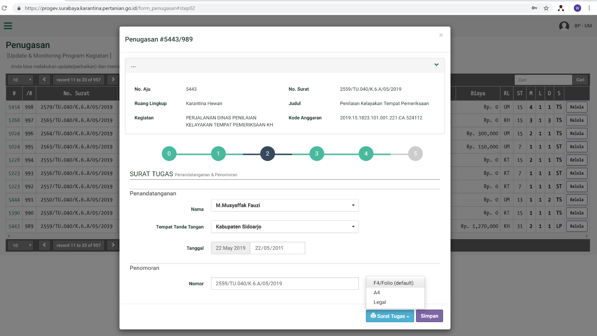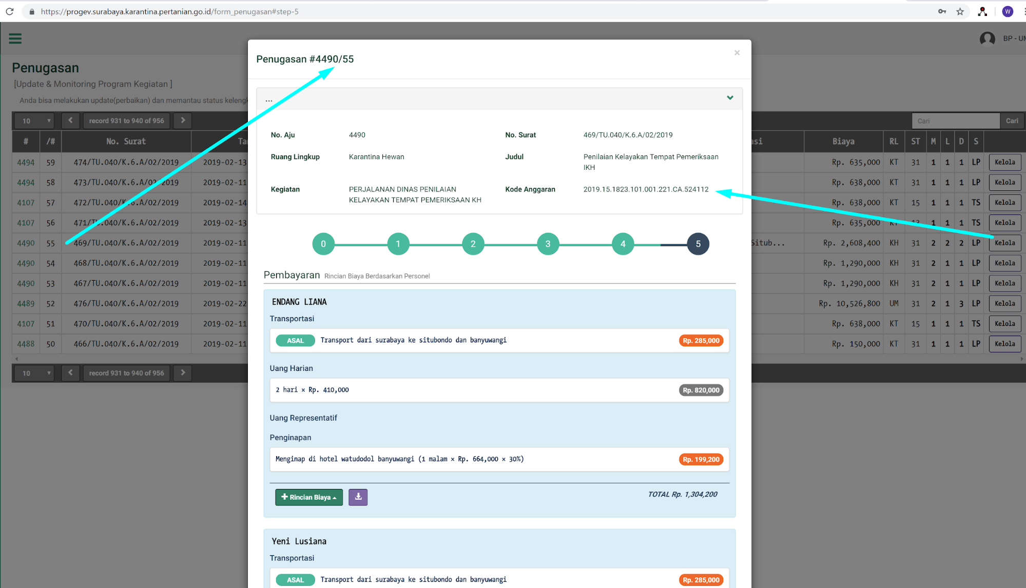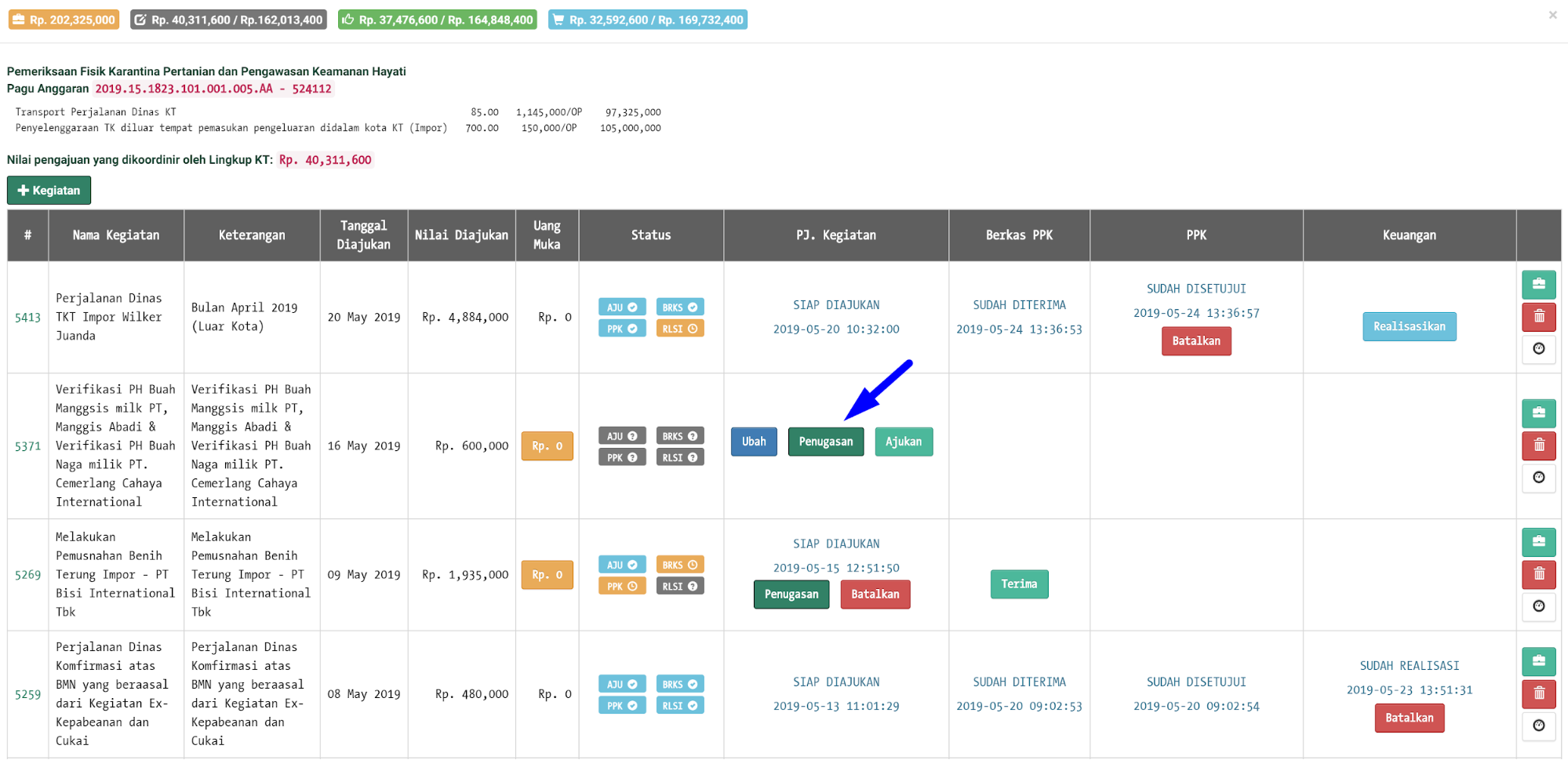 Tombol cepat dari laman Proses Realisasi ke laman Penugasan