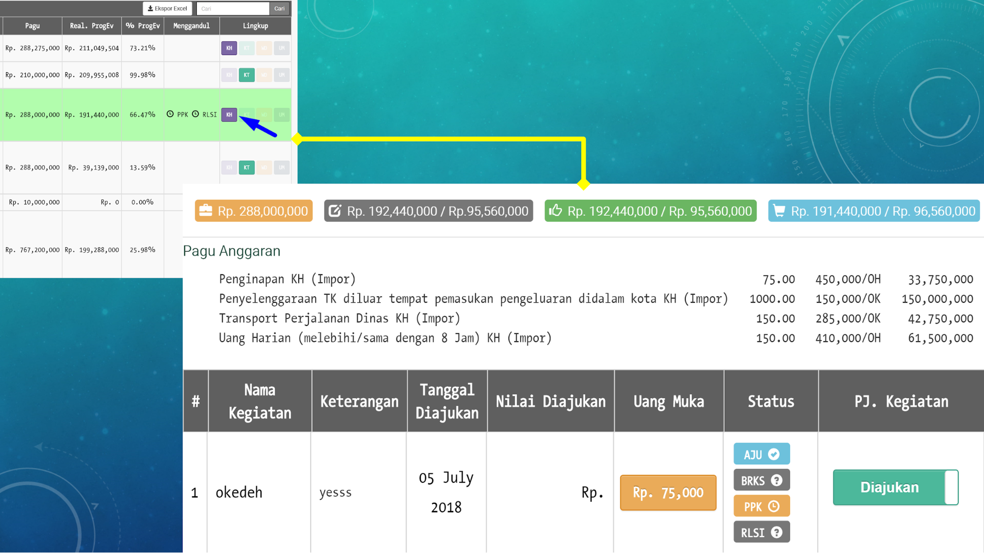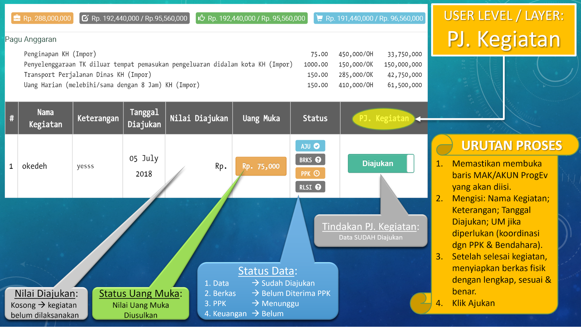 | 8. | Tidak bisa membuat pengajuan kegiatan baru. | Pastikan privilege Anda sebagai koordinator anggaran sesuai lingkup yang Anda kelola. | |