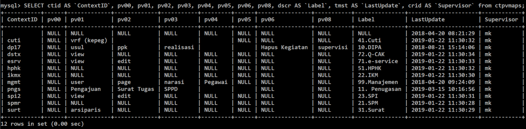 Manajemen Akses mengatur hingga sub-konteks dan sub-fungsi yang dikelompokan menurut tugas/fungsi pengguna.